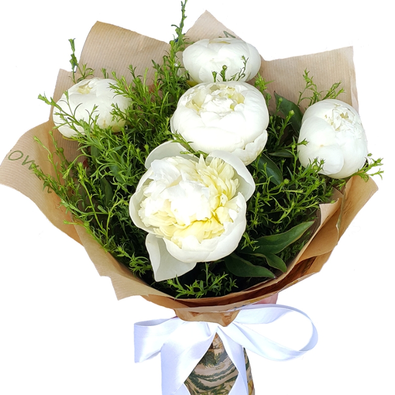 Букет состоит из 5 белых пионов, зелень, крафт, атласная лента.