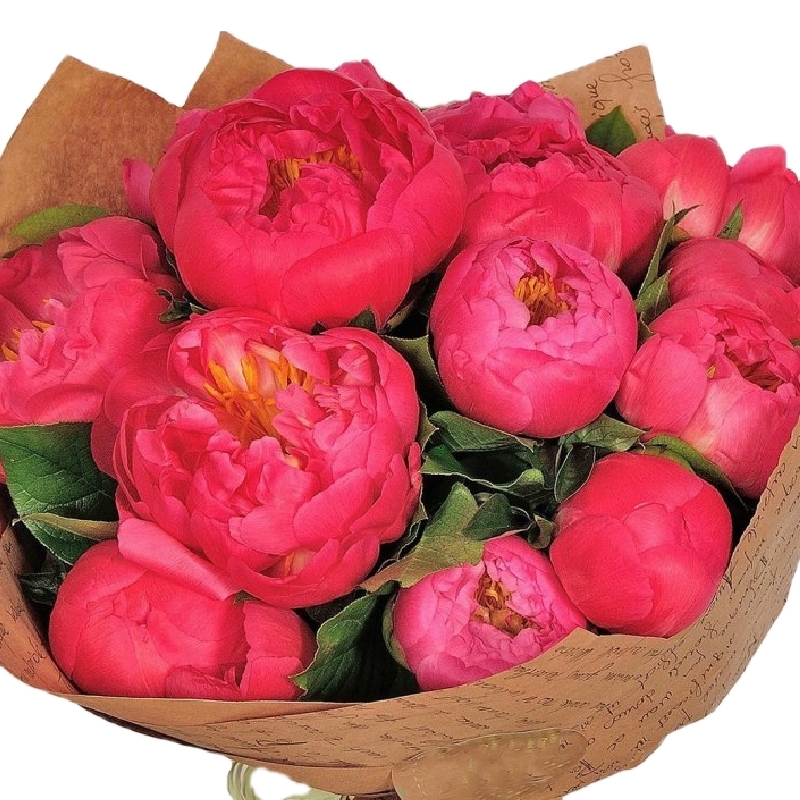 Букет состоит из 11 пионов, крафт, атласная лента.
