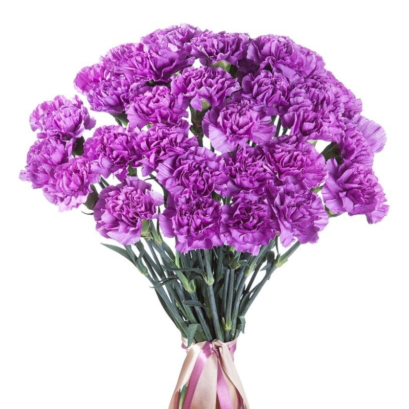 Букет состоит из 27 сиреневых гвоздик, прозрачная упаковка, атласная лента.
