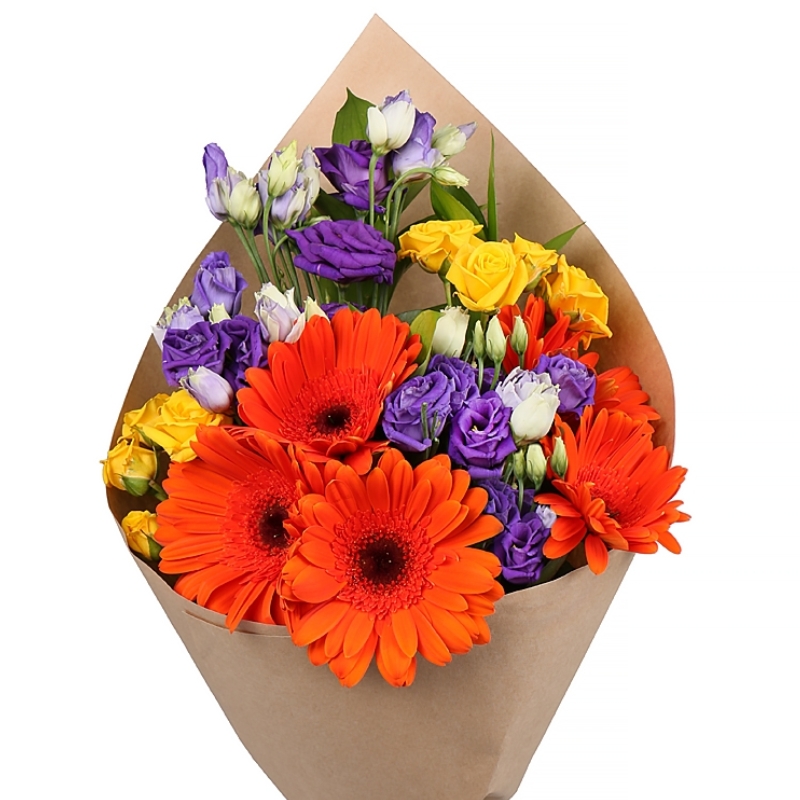 Букет состоит из 5 оранжевых гербер, 2 ветки желтой кустовой розы, 3 эустомы, крафт, атласная лента.