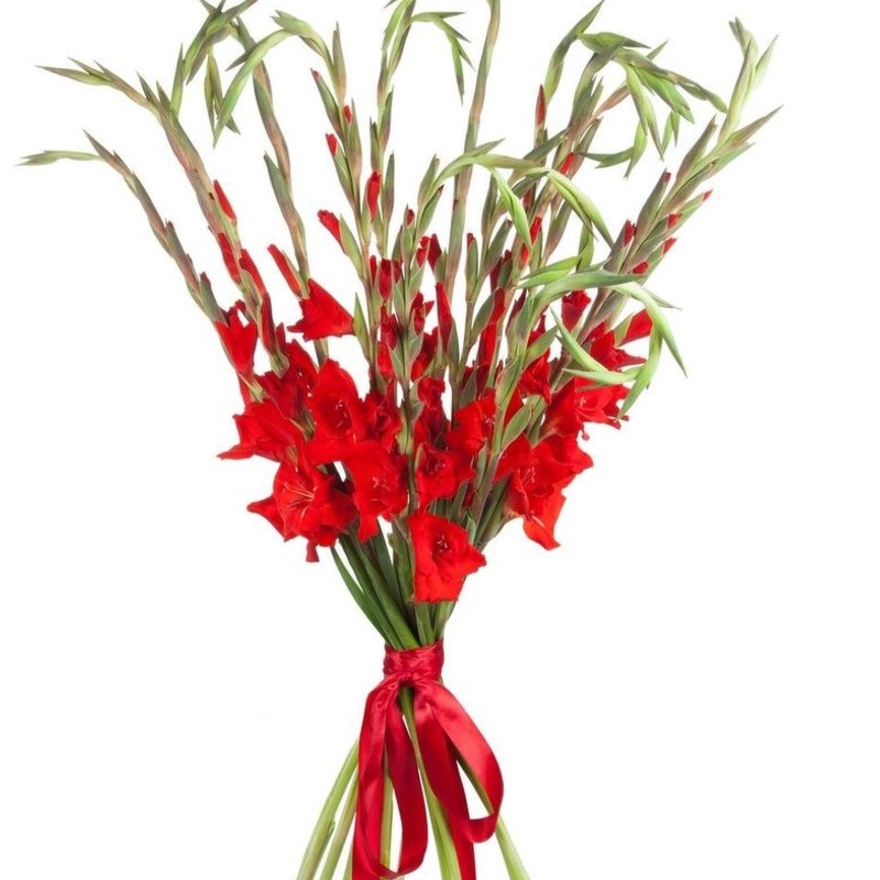 Букет состоит из 11 красных гладиолусов, прозрачная упаковка, атласная лента.