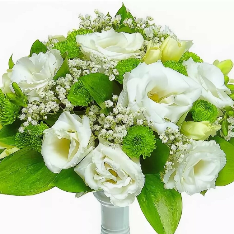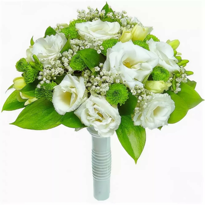 Букет состоит из 3 ветки эустомы, 5 фрезий, 3 хризантемы Сантини, 4 гипсофила, лента.