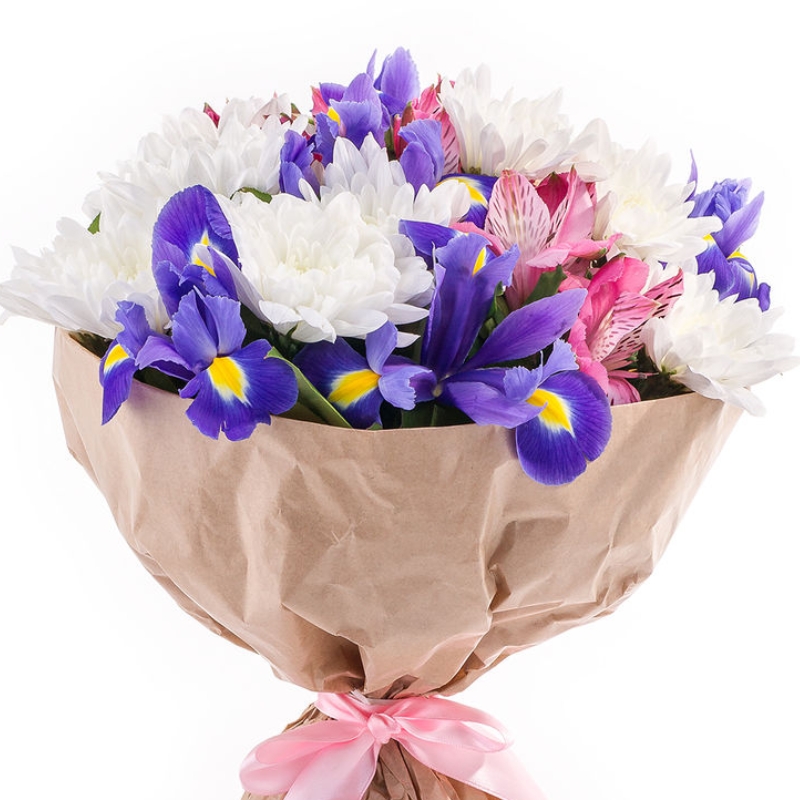 Букет состоит из 5 кустовых хризантем, 7 ирисов, 3 альстромерии, салал, крафт, атласная лента.