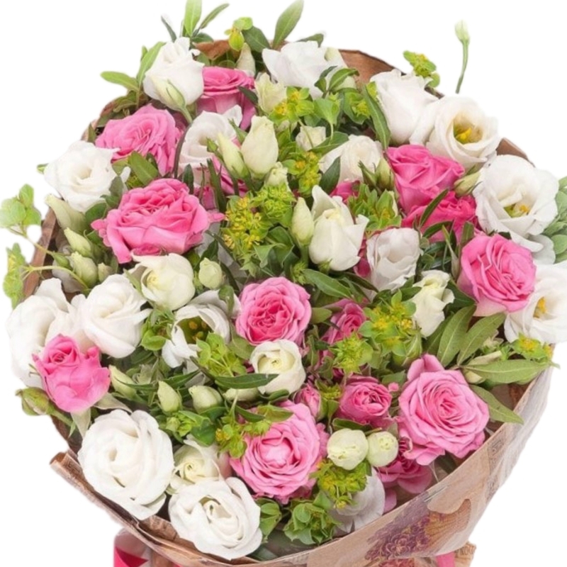 Букет состоит из 7 кустовых роз, 10 веток эустомы, зелень, крафт, атласная лента.