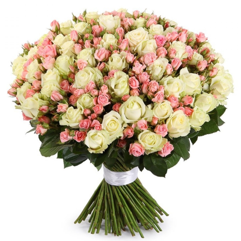 Букет состоит из 71 белая роз, 30 розовых кустовых роз, прозрачная упаковка, атласная лента.