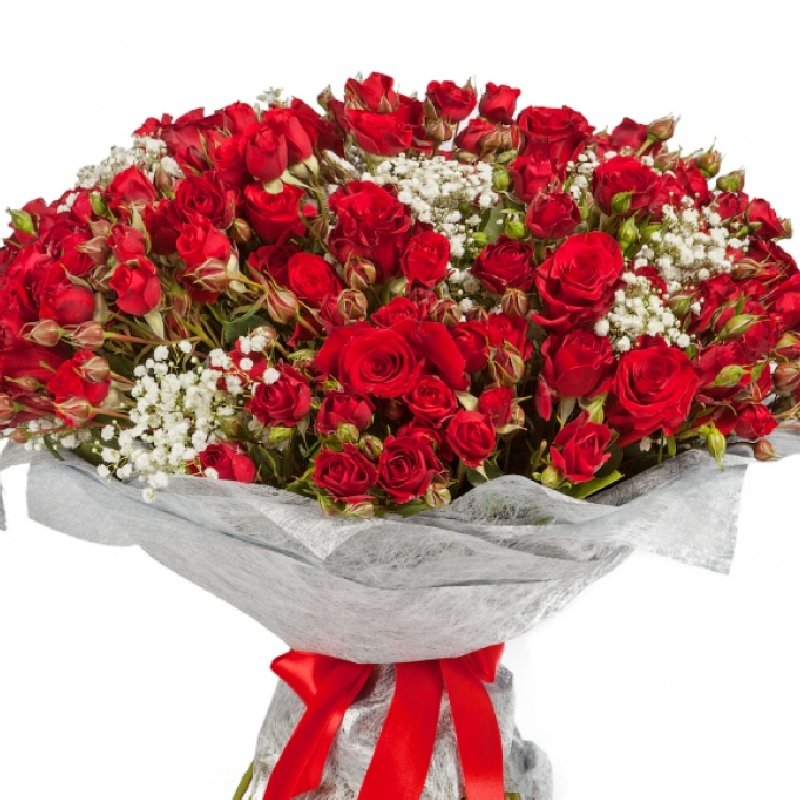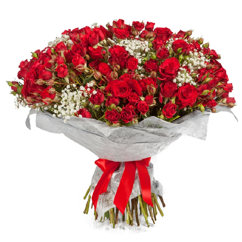 Букет состоит из 45 красных кустовых роз, 10 веток гипсофилы, красивая упаковка, атласная лента.