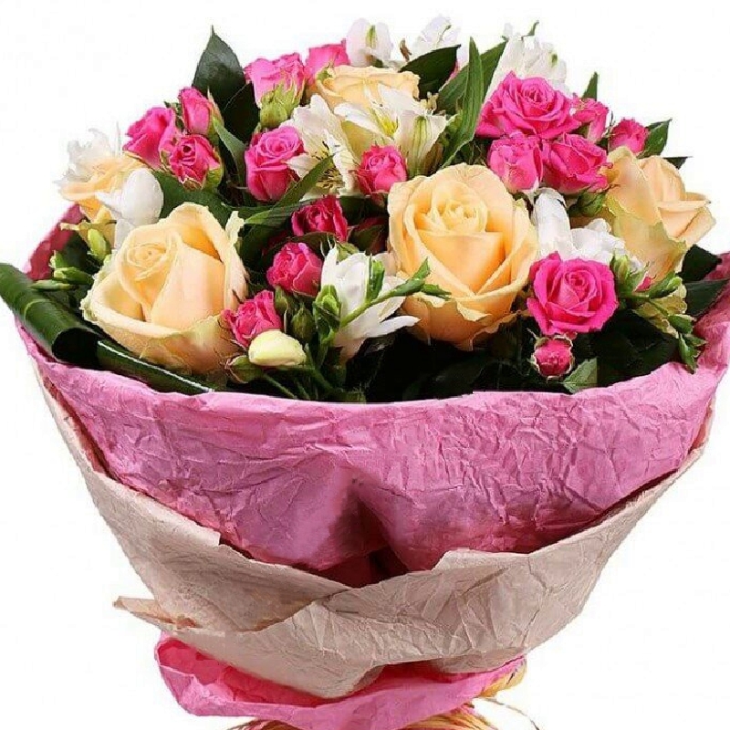 Букет состоит из 5 кремовых роз, 4 ветки кустовых роз, 2 альстромерии, 4 фрезии, зелень, крафт.