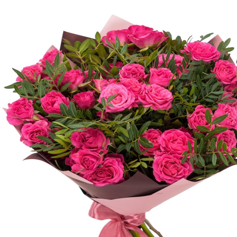 Букет состоит из 9 розовых кустовых роз, зелень, крафт, атласная лента.